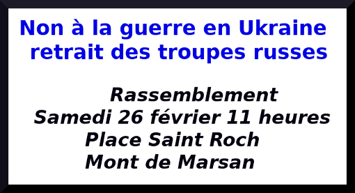 Nous invitons les organisations, les landais et landaises épris de paix à se rassembler, place Saint Roch à Mont de Marsan, ce samedi 26 février à 11 heures derrière la banderole « Non à la guerre en Ukraine– retrait des troupes russes ».